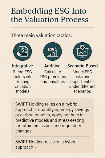 Wise firms use three main valuation tactics: integrative, additive and scenario-based ESG modeling. Swift Holding relies on a hybrid approach – quantifying energy savings or carbon benefits, applying them in predictive models and stress-testing for future emissions and regulatory changes.