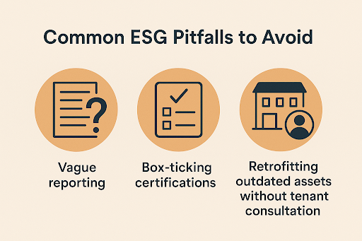 Many firms adopt ESG real estate strategies without fully aligning them to operational realities. Common missteps include vague reporting, box-ticking certifications and retrofitting outdated assets without tenant consultation.